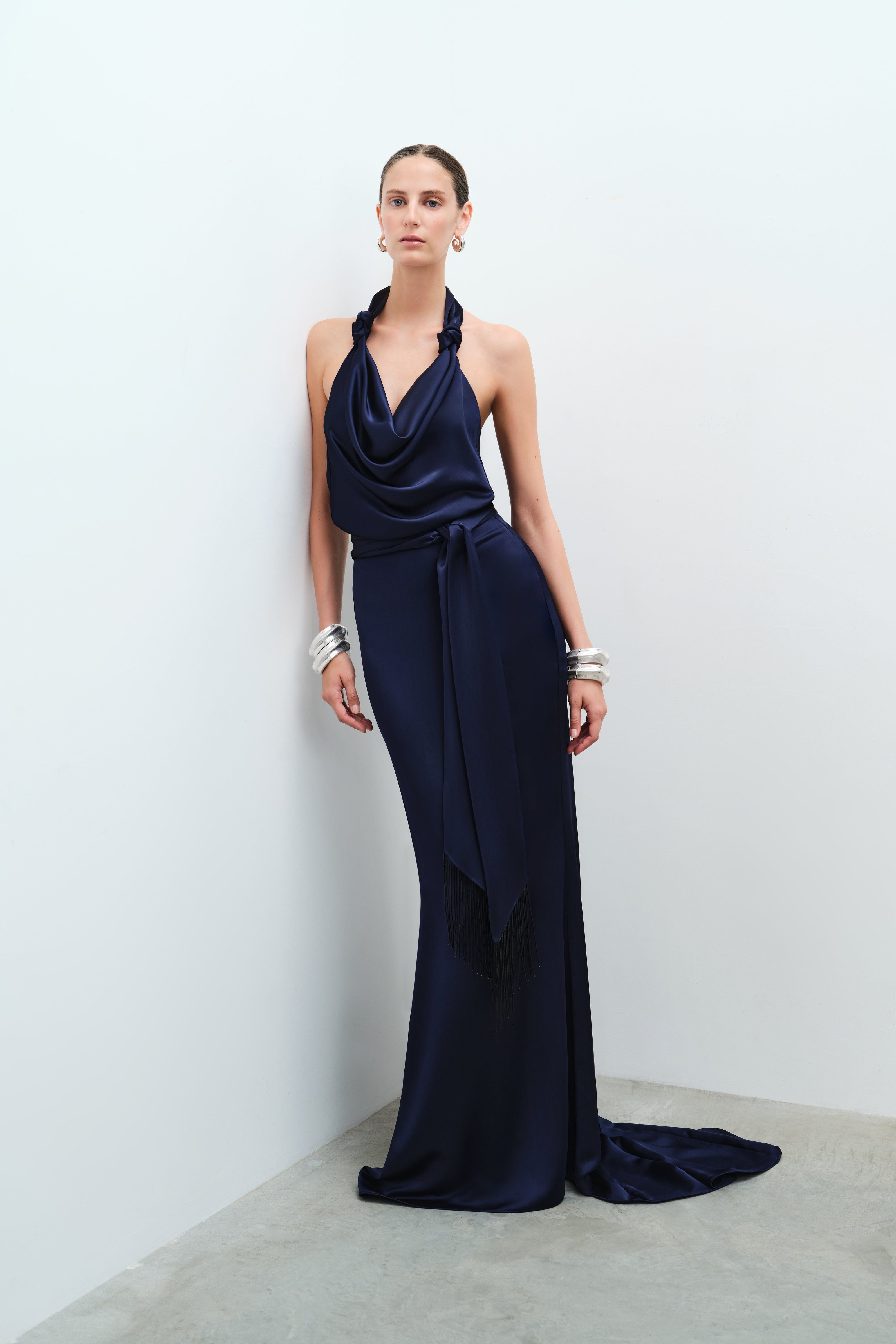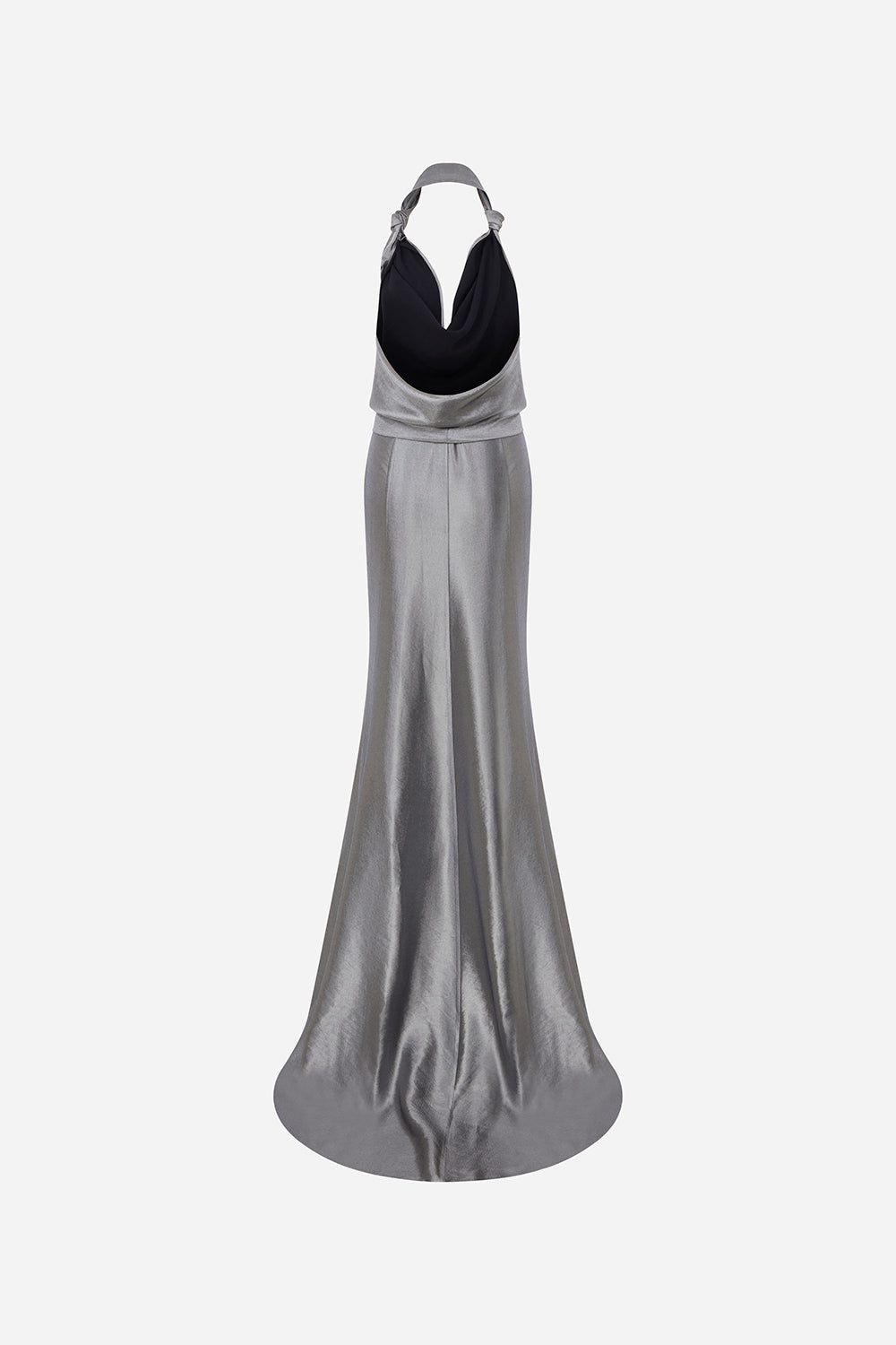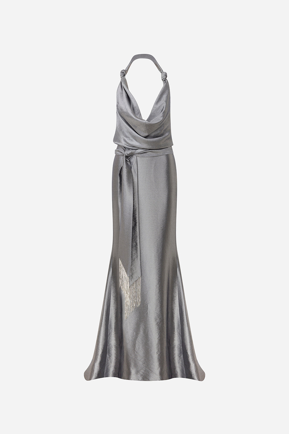 Ria - Cowl Neck Satin Maxi Dress with Beaded Fringe Belt Detail in Silver