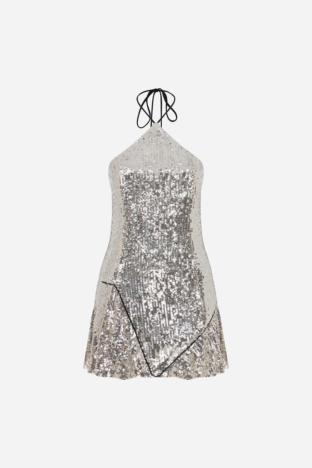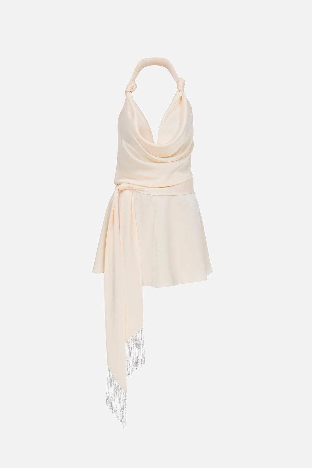 Este - Cowl Neck Satin Mini Dress With Beaded Fringe Belt Detail
