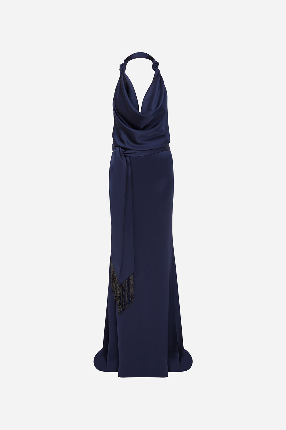 Ria - Cowl Neck Satin Maxi Dress with Beaded Fringe Belt Detail in Black